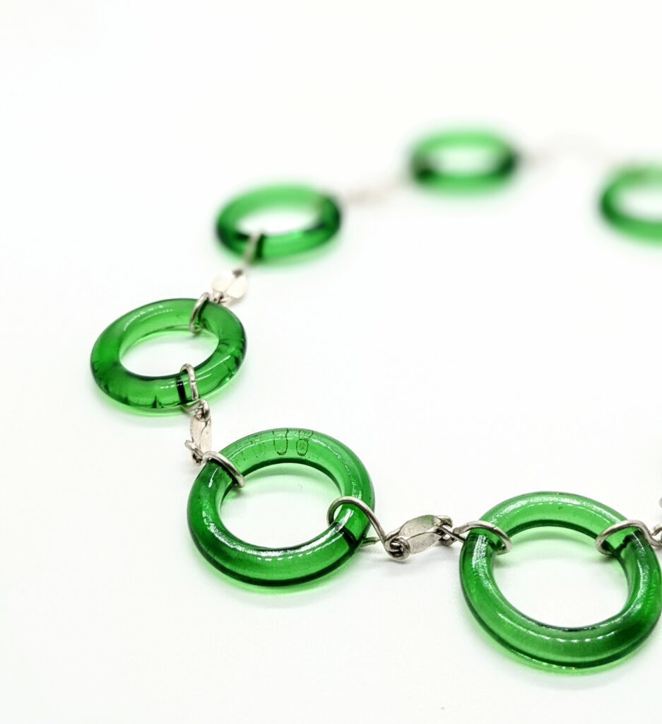 La démarche est à la fois artisanale et écoresponsable : le verre de bouteilles recyclées devient matière première d’objets uniques, façonnés à la main et pensés pour être portés.