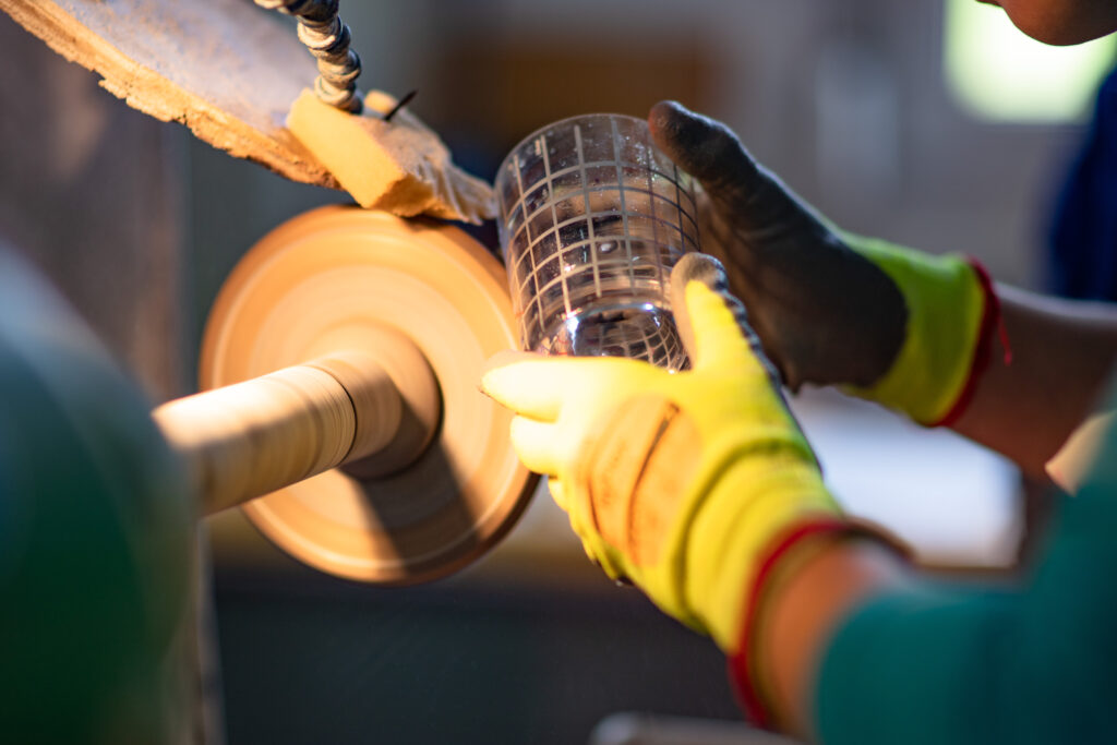 C’est une technique à froid, et c’est un métier qui demande d’être calme, concentré, on est sur une machine sans bouger. Ça demande quand même de la concentration. C’est différent du travail en équipe à chaud (soufflage à la canne), c’est un travail personnel, on est face à notre machine et notre pièce.