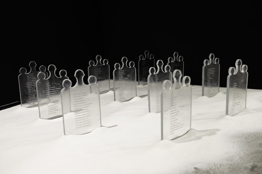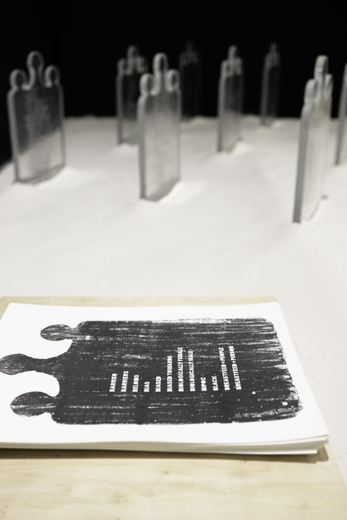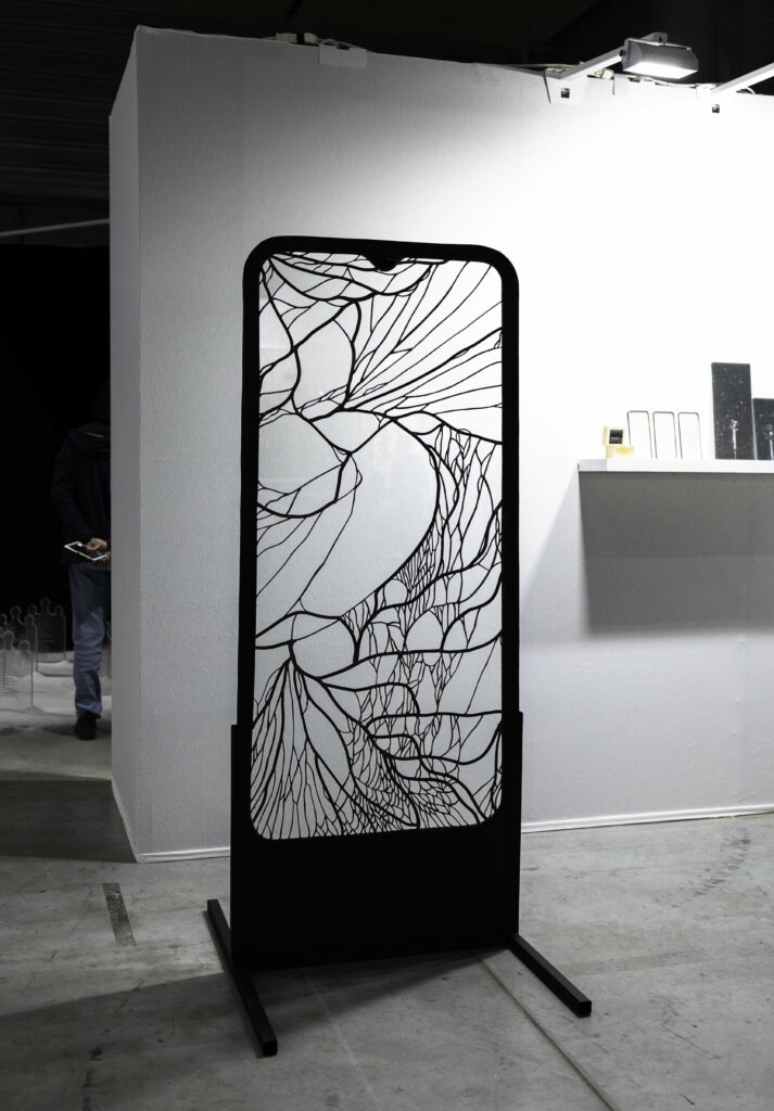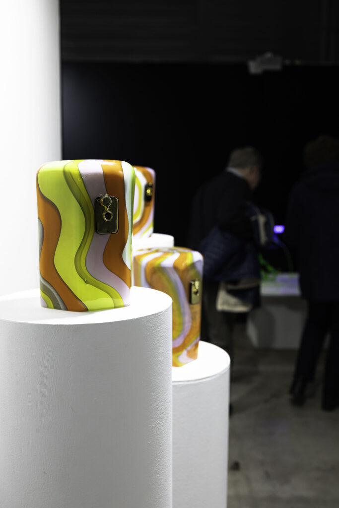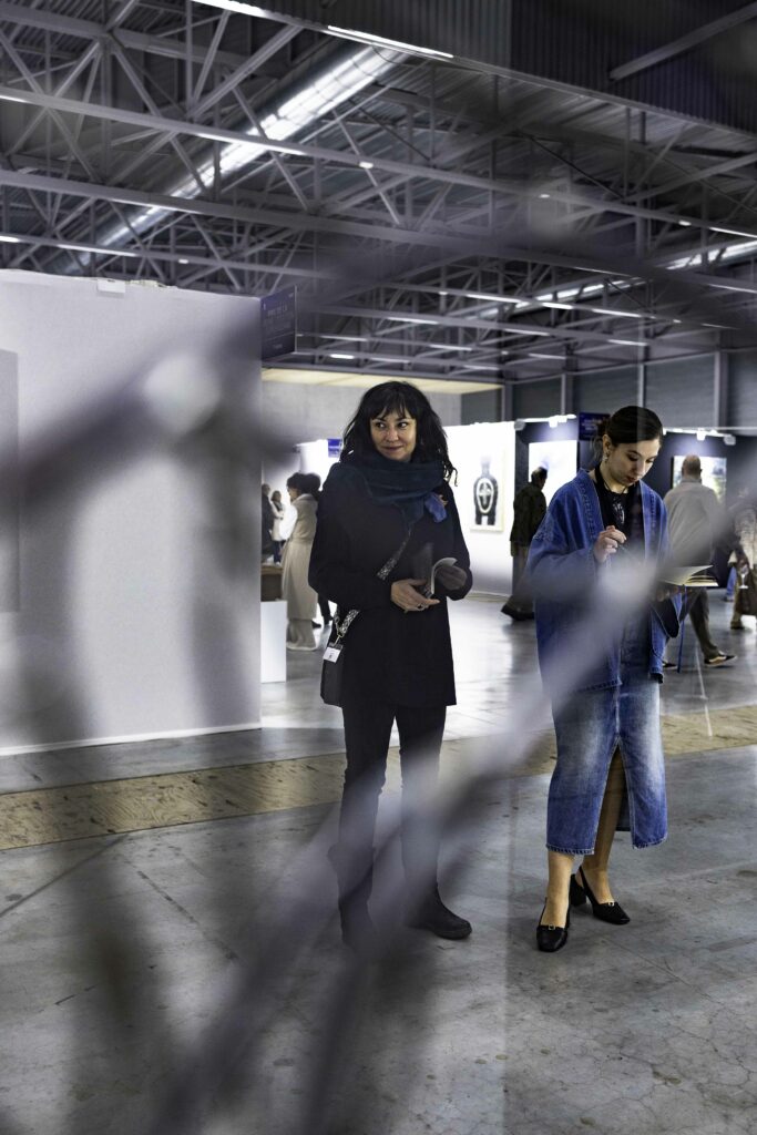 “On a beaucoup de chance parce qu’on a un espace de 70 m2, c’est un grand stand qui permet d’accueillir les 7 exposantes. Nous avons conçu la scénographie selon une circulation dans cet espace. Nous avons utilisé des fonds noir et blanc pour faire ressortir nos pièces différemment et délimiter les différents projets.