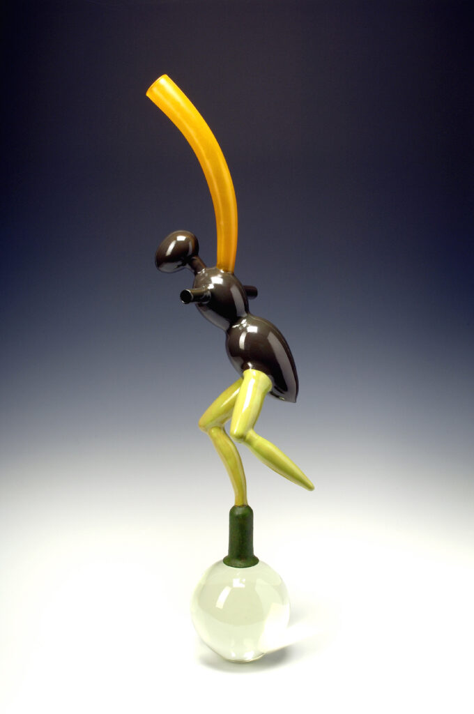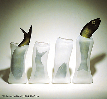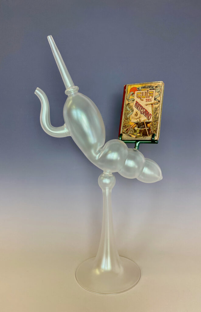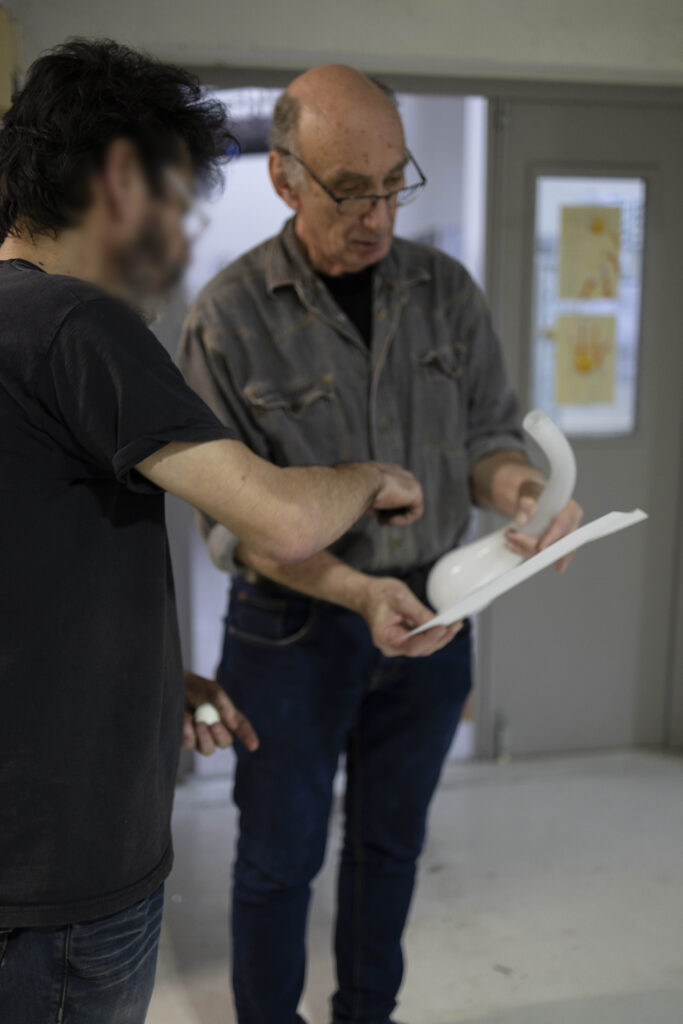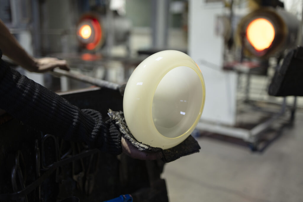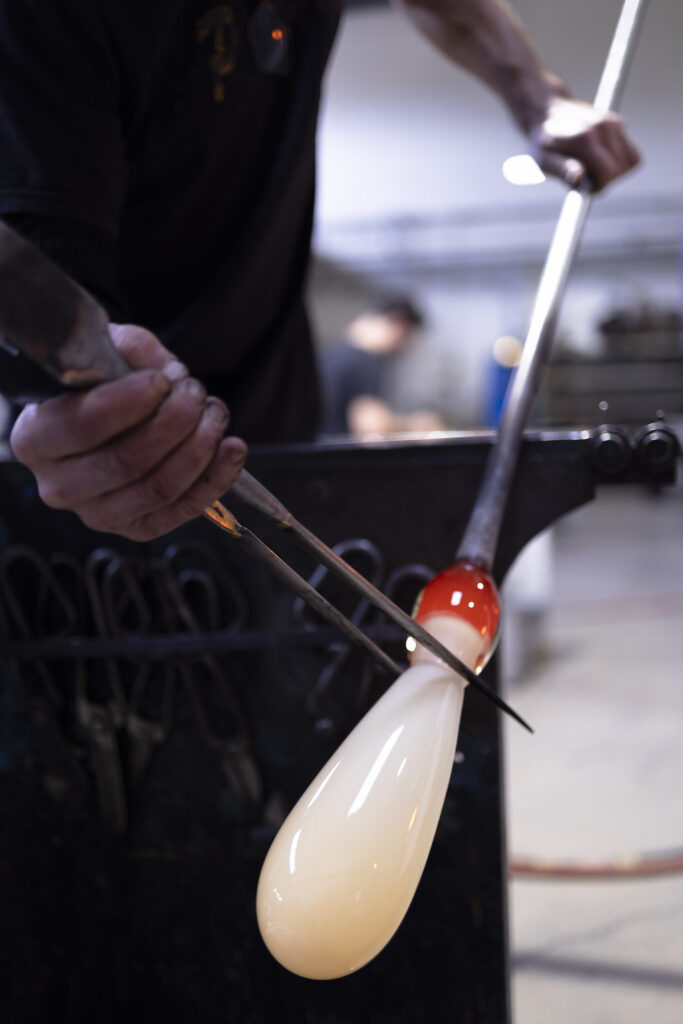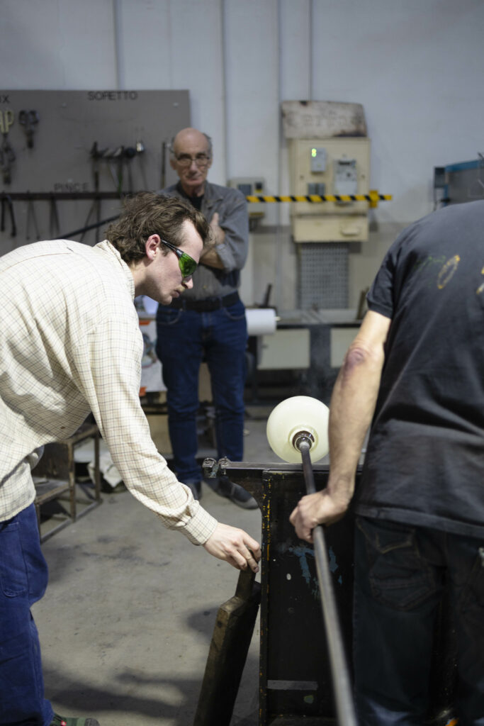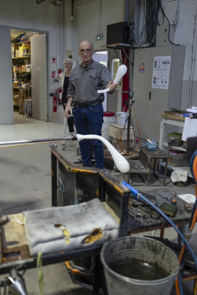 Les formes que je veux produire sont possiblement réalisables en soufflage à la canne. J’ai découvert très vite que Jean-Pierre Mateus (formateur au Cerfav) va pouvoir créer ce que j’ai imaginé, et j’en suis très heureux ! Je vais donc profiter de mon temps de travail avec lui pour réaliser des formes qui constitueront le lustre.